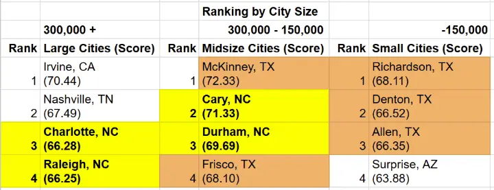 When stories are picked up and shared, they often miss the most obvious and simplest patterns in the data. One local headline only picked out Cary, North Carolina as being #2 overall. When I started looking at all the data it became clear to me that the bigger story were the 2 larger metropolitan areas that dominated. This synopsis is a very useful tool in our arsenal, but we can also evaluate the 17 data metrics that they formulated to arrive at this ranking.